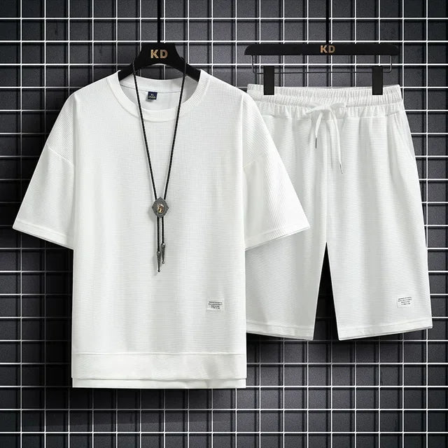 Men's Summer Waffle Set Brand Fashion Casual T-shirt+Shorts Set Men's Sports Set Loose ComfortableSlow RunningQuick Dr