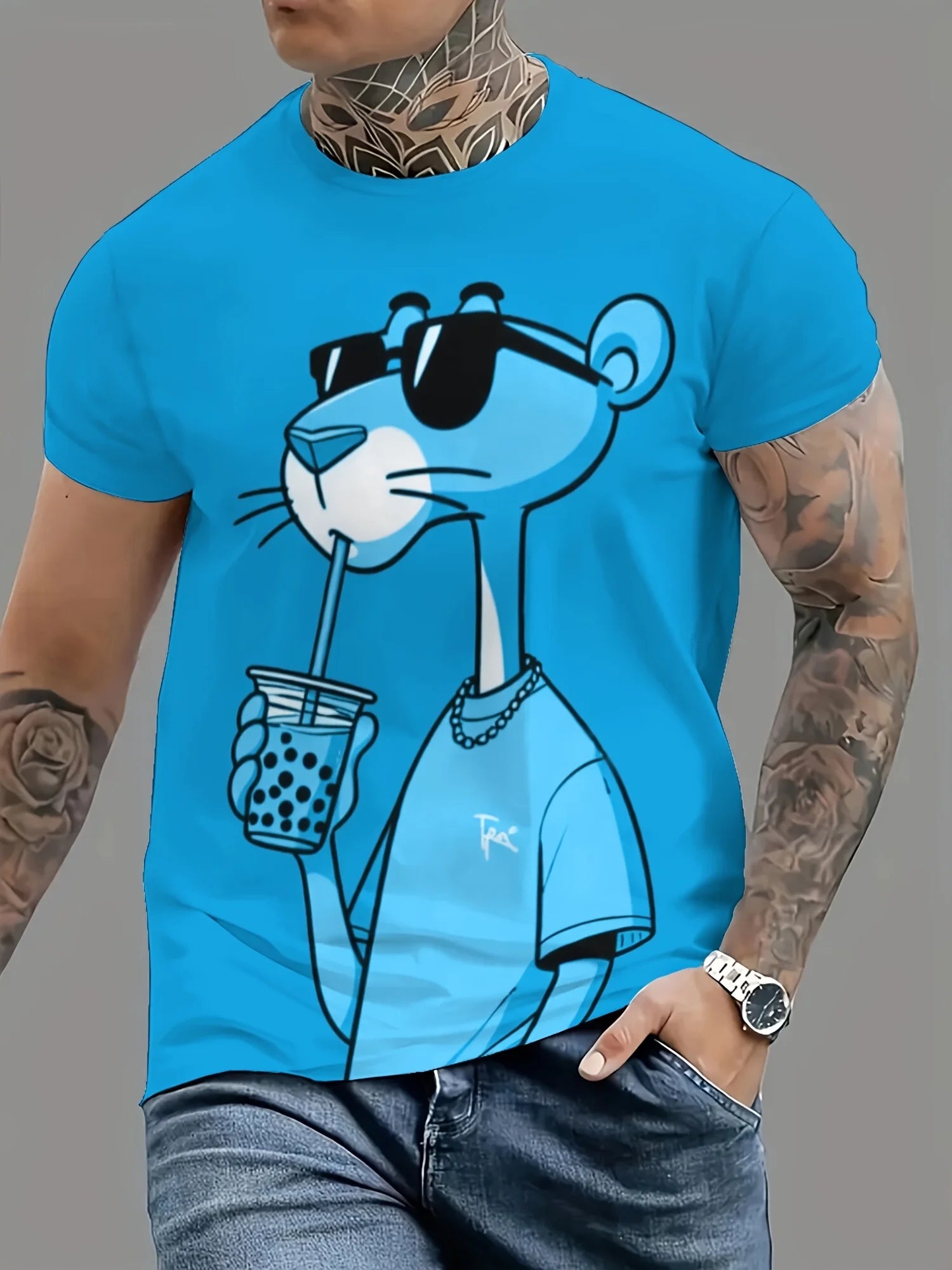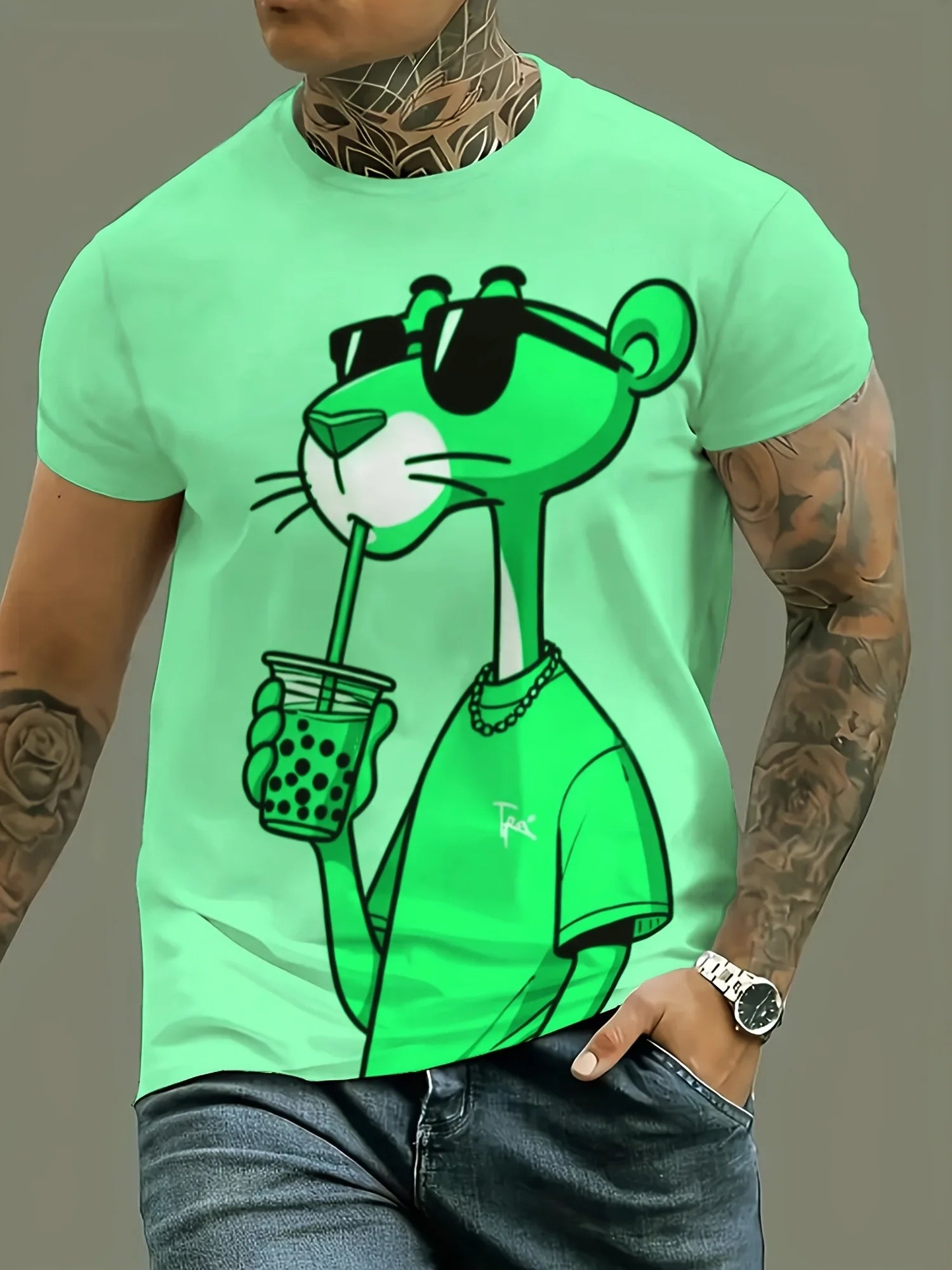 Summer New Mens T-shirts Cartoon Pink Panther Print Short Sleeve O-neck Tees Casual Loose Daily Sports Oversized Unisex Tops